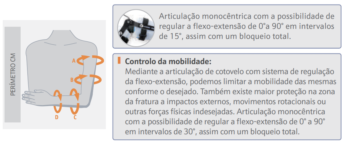 Mediante a articulação de cotovelo com sistema de regulação da flexo-extensão, podemos limitar a mobilidade das mesmas conforme for desejado. Também existe maior proteção na zona da fratura a impactos externos, movimentos rotacionais ou outras forças físicas indesejadas.