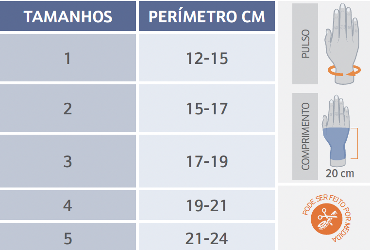 Fabricado com material elástico suave, com fechos velcro, tala flexível palmar removível e tala de polegar flexível moldável.